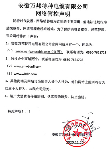鄭重聲明:安徽萬邦特種電纜有限公司官方網站為:www_wanbangcable_com.0471yake.cn,除此之外無任何子網站或合作網站,其余均為假冒偽劣。電話:0550-7621728 13485756353 地 址:安徽省天長市滁州高新技術產業開發區經四路29號